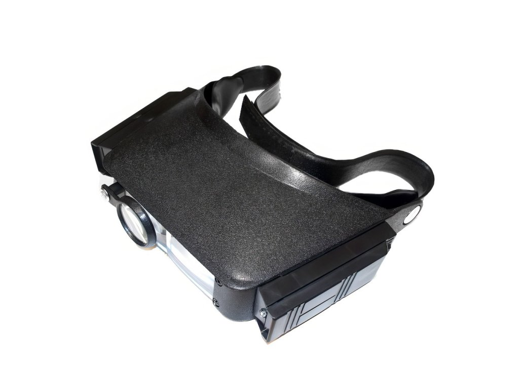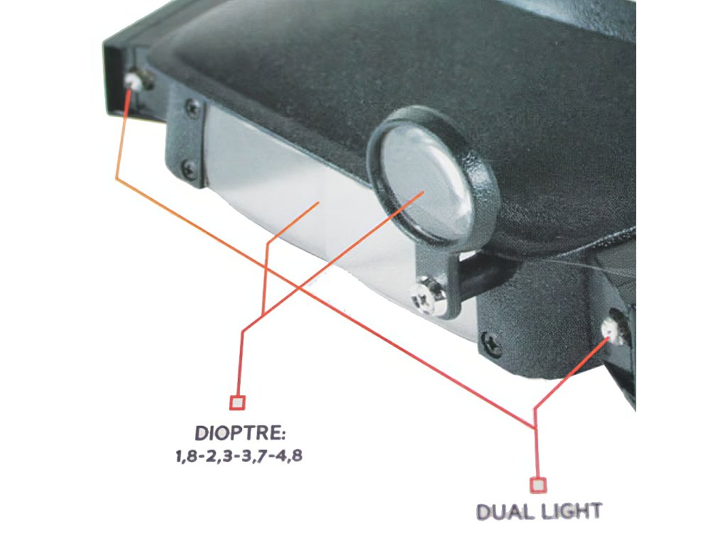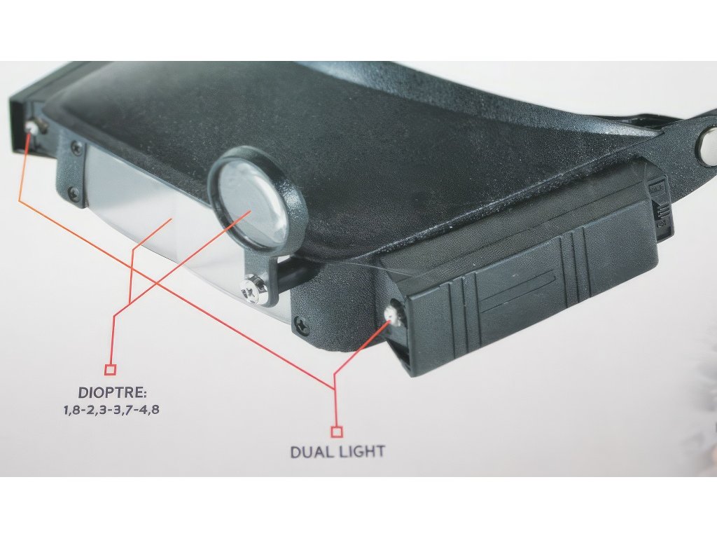 Čelní binokulární lupa s dvojitým žárovkovým osvětlením. Pevná plankonvexní dvojčočka. Sklopná plankonvexní dvojčočka. Osvětlení - 2 ks žárovek, napájení 2 x 2 ks tužkových baterií typ AA/UM 3-1,5V, které nejsou součástí lupy. Čelní binokulární lupa je uchycena pomocí nastavitelného náhlavního pásku se suchým zipem. Hlavová čelní včelařská lupa s osvětlením, nastavitelná čelenka pro optimální nastavení kolem hlavy.
