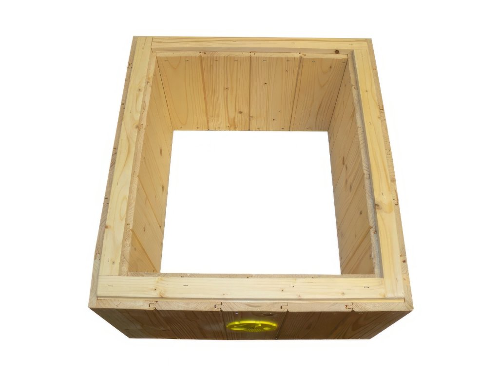Všechny naše nástavky mají nyní kvalitní drážkový spoj na základním dřevěném rámu, který tvoří kostru nástavku. Na obrázku vidíte kostru nástavku bez polystyrenu a vrchní vrstvy palubek. Zpevněný rám tvoří kostru nástavku a nachází se uvnitř nástavku pod palubkami.