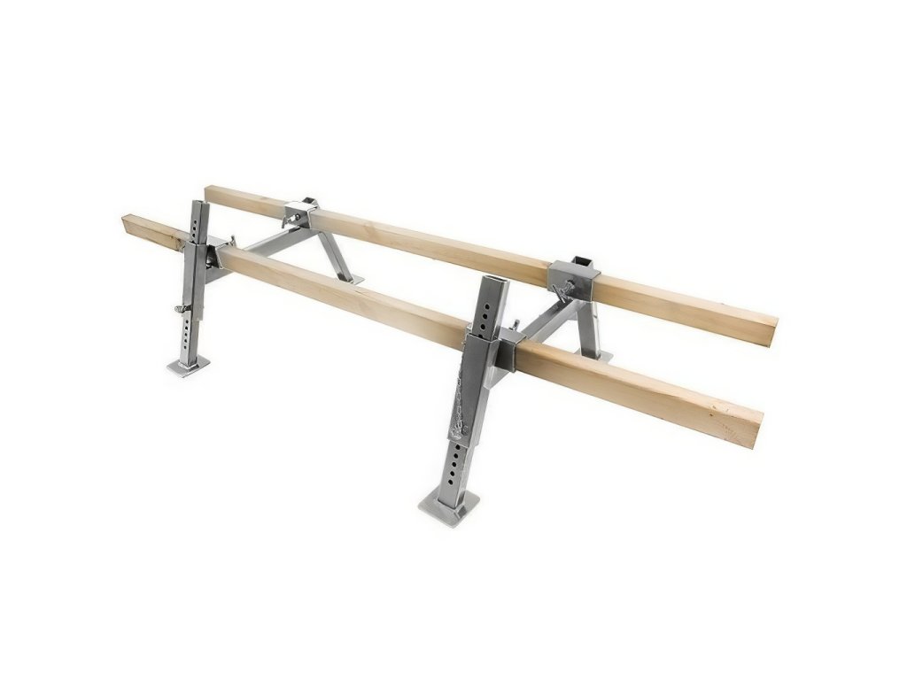 Pro sestavení je potřeba 2 ks stojanu a 2 ks dřevěné latě. Pokud budou hranoly delší, bude nutné dle potřeby použít více kusů stojanu, aby se dřevěné hranoly neprohýbaly.
