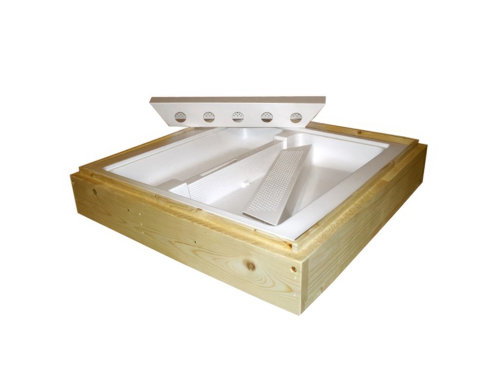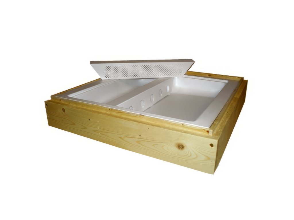 Stropní krmítko s plastovou vanou o kapacitě 5 litrů roztoku. Velice praktické a v dnešní době jedna z nejpoužívanějších variant krmítka. Předností je jednoduchá instalace na úl a snadné doplňování roztoku bez zbytečného obtěžování včel. Krmítko se skládá z dřevěné konstrukce o rozměrech na variantu úlu Tachov, kterou máme v nabídce. Součástí je také plastový vnitřek o tloušťce 1,5 mm a plastové tunýlky, které brání včelám v přímém styku s roztokem, ve kterém by se mohli utopit.