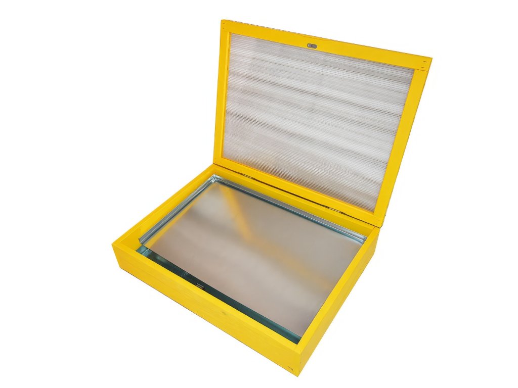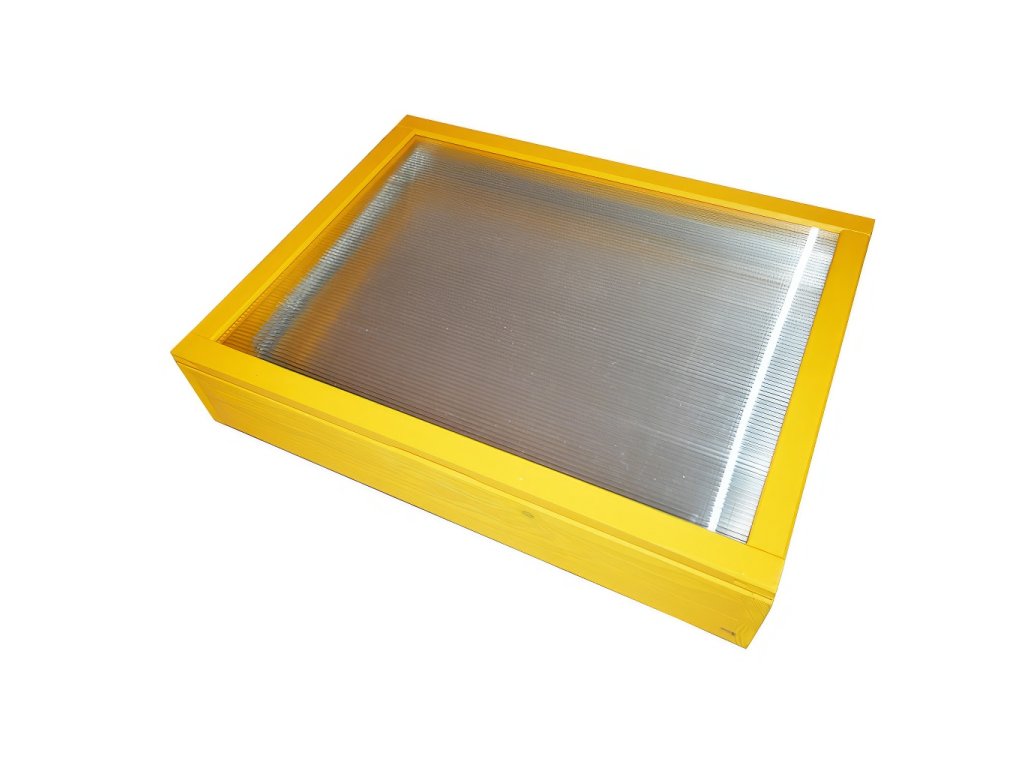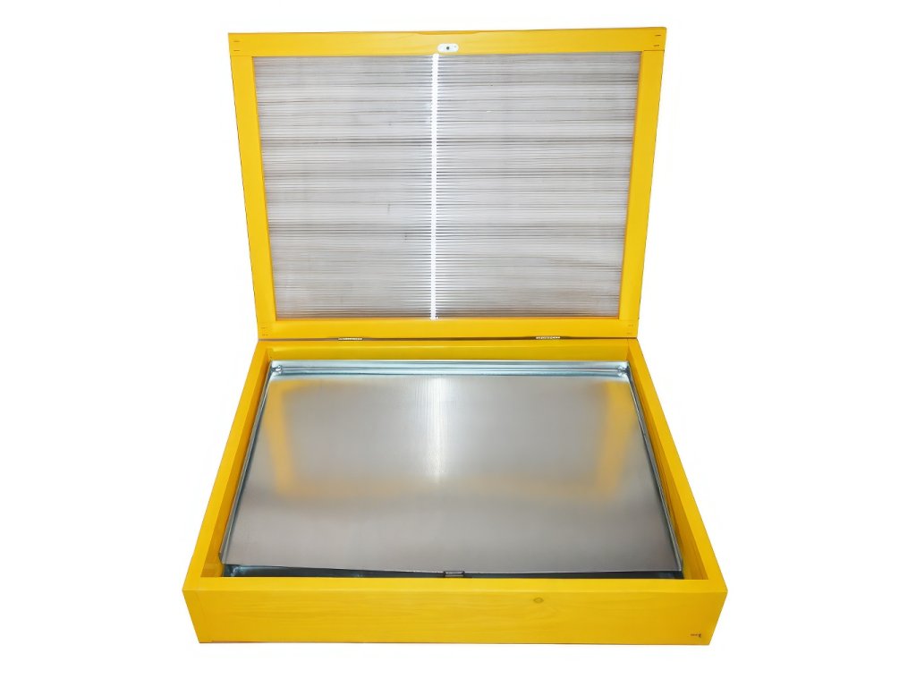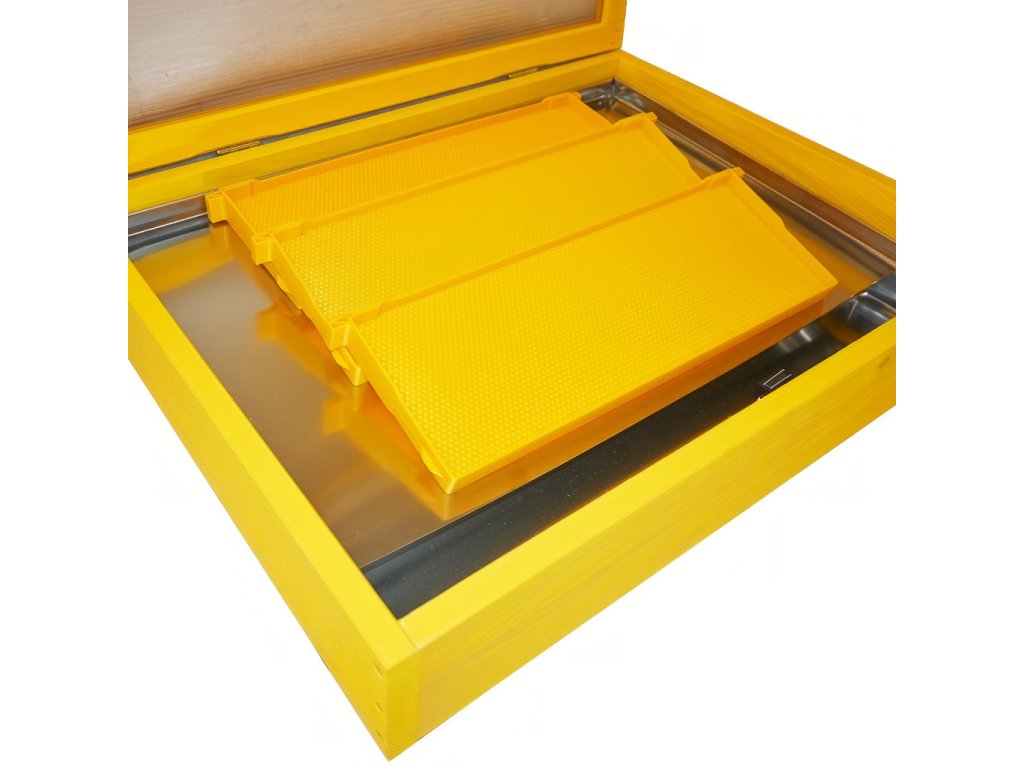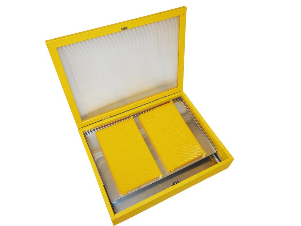 Sluneční pocínované tavidlo s polykarbonátem. Sluneční tavidlo s polykarbonát Vám usnadní práci s zpracováním vosku. Občas je totiž nutné staré rámky a voští vytaví. Za slunečného dne vyndáme tavidlo na co nejslunnější místo, podložíme ho do mírného úhlu a naplníte ho rámky popřípadě voštím. Vosk se začíná při dobrých podmínkách obvykle rychle tavit. Při venkovních teplotách 20 až 30°C tak cca za 15-20 minut a za 25-35 minut je již převážná část z vosku vytavena s přeteklá do vaničky na vosk.